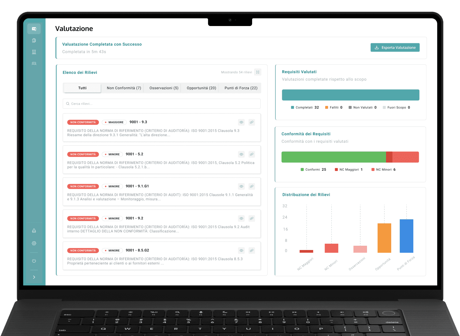 Attraverso un’analisi e valutazione intelligente dei requisiti, individua Non Conformità, incoerenze ed evidenze mancanti, generando una valutazione dettagliata, tracciabile e coerente con le aspettative di certificazione, in conformità alle norme ISO applicabili.